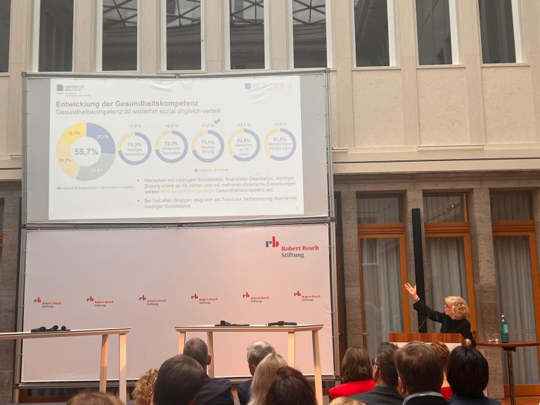 Im Mittelpunkt stand die dritte Studie zur Gesundheitskompetenz in Deutschland (HLS-GER 3). Die Ergebnisse zeigen ein vorsichtig positives Bild: Insgesamt hat sich die Gesundheitskompetenz der Bevölkerung leicht verbessert. 44 Prozent der Befragten verfügen über eine hohe Gesundheitskompetenz, das sind drei Prozentpunkte mehr als noch vor fünf Jahren.